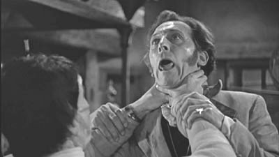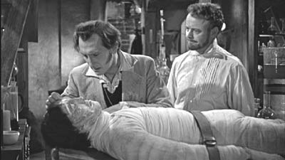 awfully disfigured face, and Peter Cushing unwrapping a pair of
